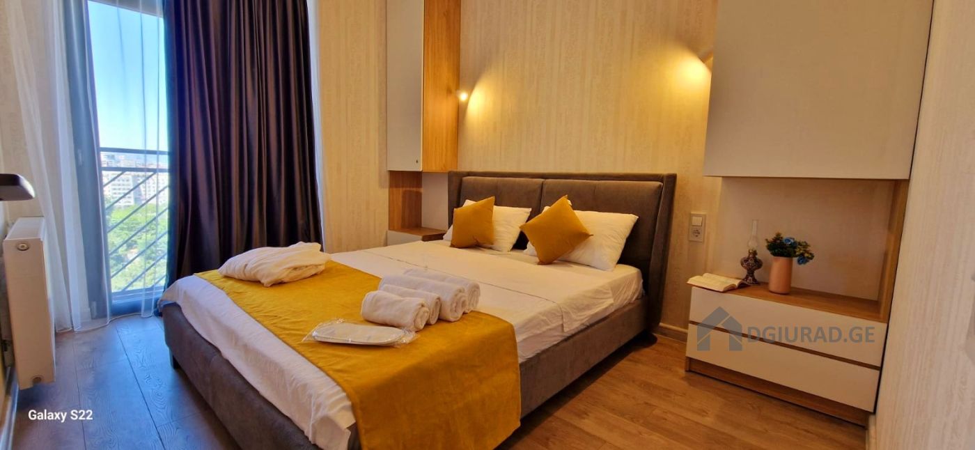 Apartment for daily rent in a newly built building. In the apartment you will find all necessary equipment: towels, bathrobes, disposable slippers, bed linen, hygiene products (shampoo, liquid soap, toothbrush and paste, hygiene kit, toilet paper), dishes, water, tea/coffee. The apartment has a refrigerator, electric kettle, microwave oven, washing machine with dryer, hair dryer, TV and WIFI. There is a beautiful view from the balcony. You will feel cozy and comfortable. Price from 50 GEL (depending on the duration of the reservation).