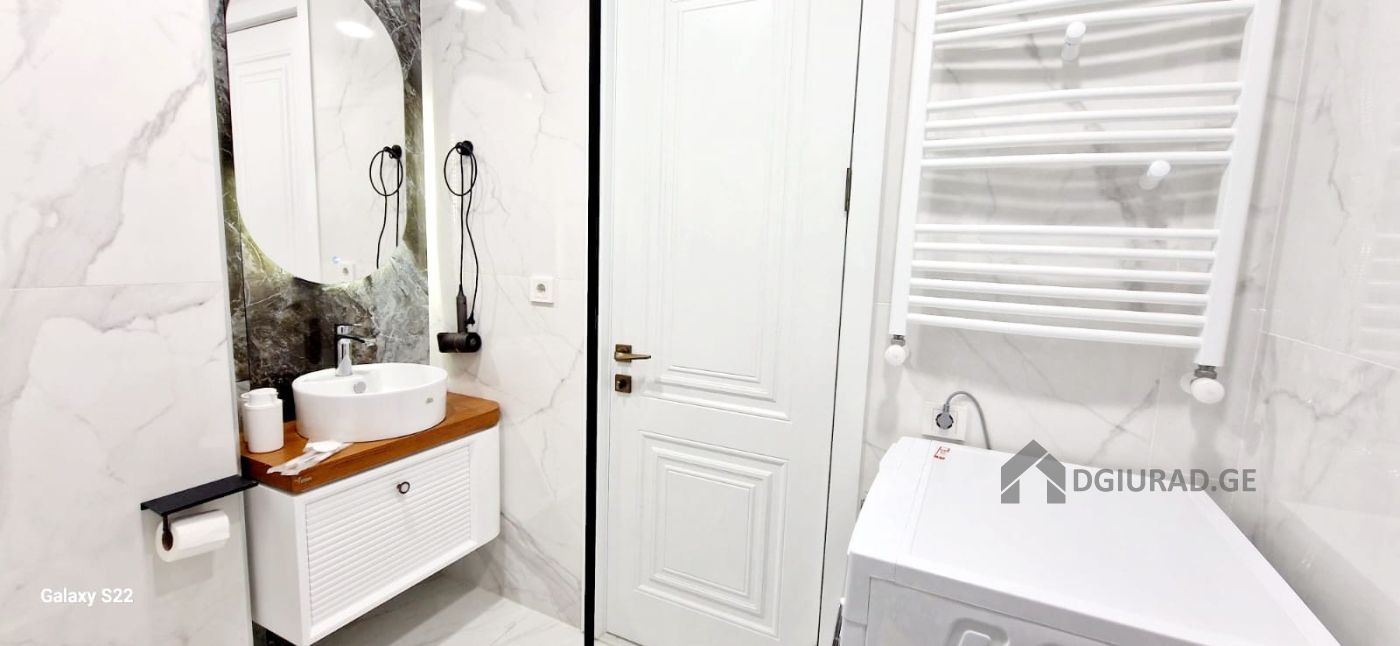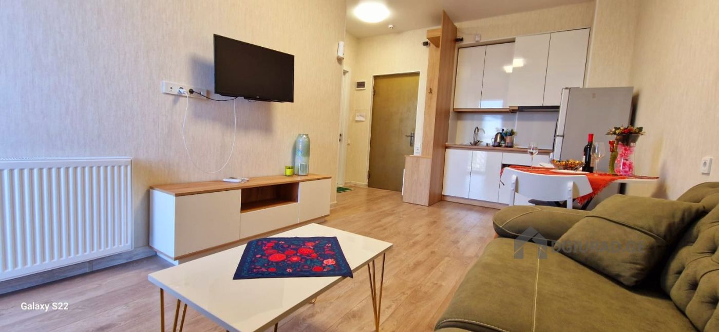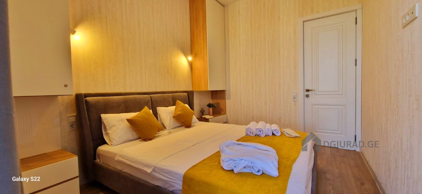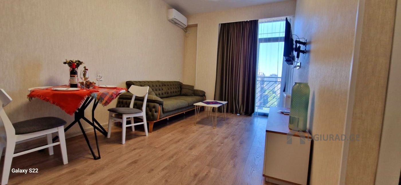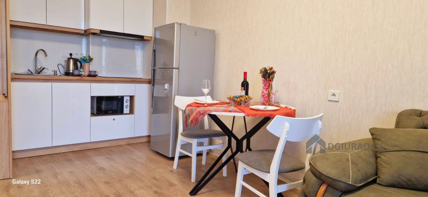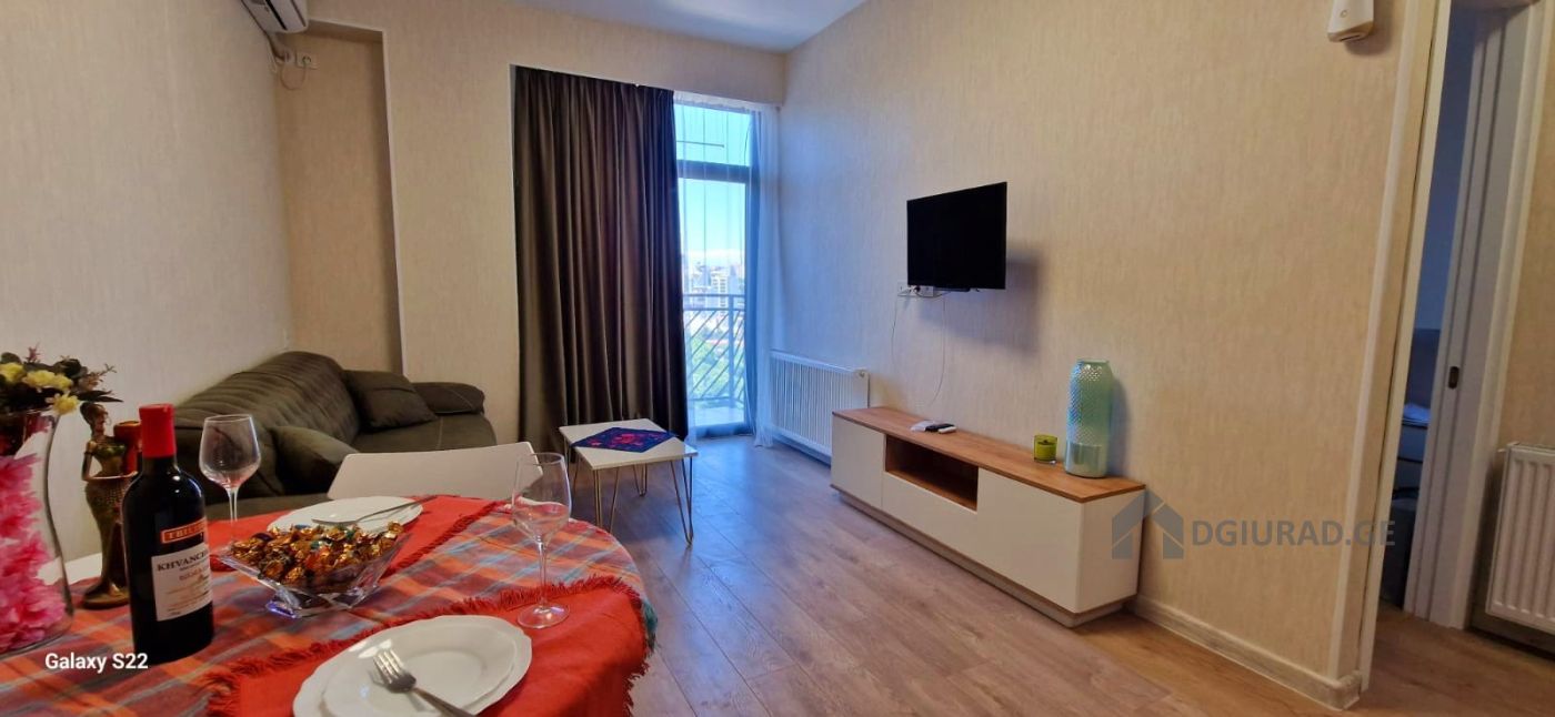Apartment for daily rent in a newly built building. In the apartment you will find all necessary equipment: towels, bathrobes, disposable slippers, bed linen, hygiene products (shampoo, liquid soap, toothbrush and paste, hygiene kit, toilet paper), dishes, water, tea/coffee. The apartment has a refrigerator, electric kettle, microwave oven, washing machine with dryer, hair dryer, TV and WIFI. There is a beautiful view from the balcony. You will feel cozy and comfortable. Price from 50 GEL (depending on the duration of the reservation).