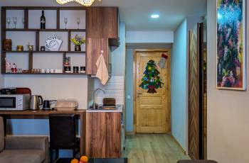 ● სამზარეულო, ჩაშენებული ქურით, მაცივარი, აბაზანა, ცენტრალური გათბობა. ჭურჭელი, თმის ფენი, უთო, ტელევიზორი, ინტერნეტი ყველანაირად აღჭურვილია.