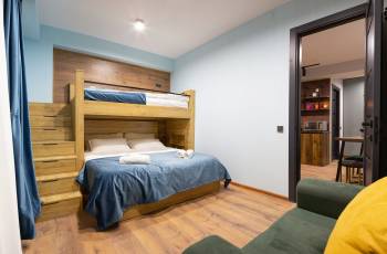 აპარტამენტი მაქსიმუმ 6 ადამიანზე მდებარეობს ახალ გუდაურში კომპლექს რედკოს F4-ში. საბაგიროდან და სასრიალო ტრასიდან დაშორებულია 100 მეტრით. გარშემო არის რესტორნები, ბარები, თხილამურების ქირაობა, საბავშვო სივრცეები. ბინის მისაღებში არის სრულიად აღჭურვილი სამზარეოლო, დიდი და პატარა მაგიდა, გასაშლელი დივანი და ტელევიზორი. საძინებელში დგას ორსართულიანი საწოლი (პირველი სართული-ორადგილიანი საწოლი, მეორე სართული-ერთიანი) და გასაშლელი სავარძელი. სველ წერტილში მოთავსებულია სარეცხი მანქანა და თმის ფენი. აპარტამენტს აქვს აივანი, რომელიც გადაჰყურებს საბაგიროსა და მთებს. აქ დაგხვდებათ ყოველივე რაც დაგჭირდებათ: თეთრეული, პირსახოცები, საყოფაცხოვრებო ნივთები, სამაგიდო თამაშები და თბილი გარემო.
